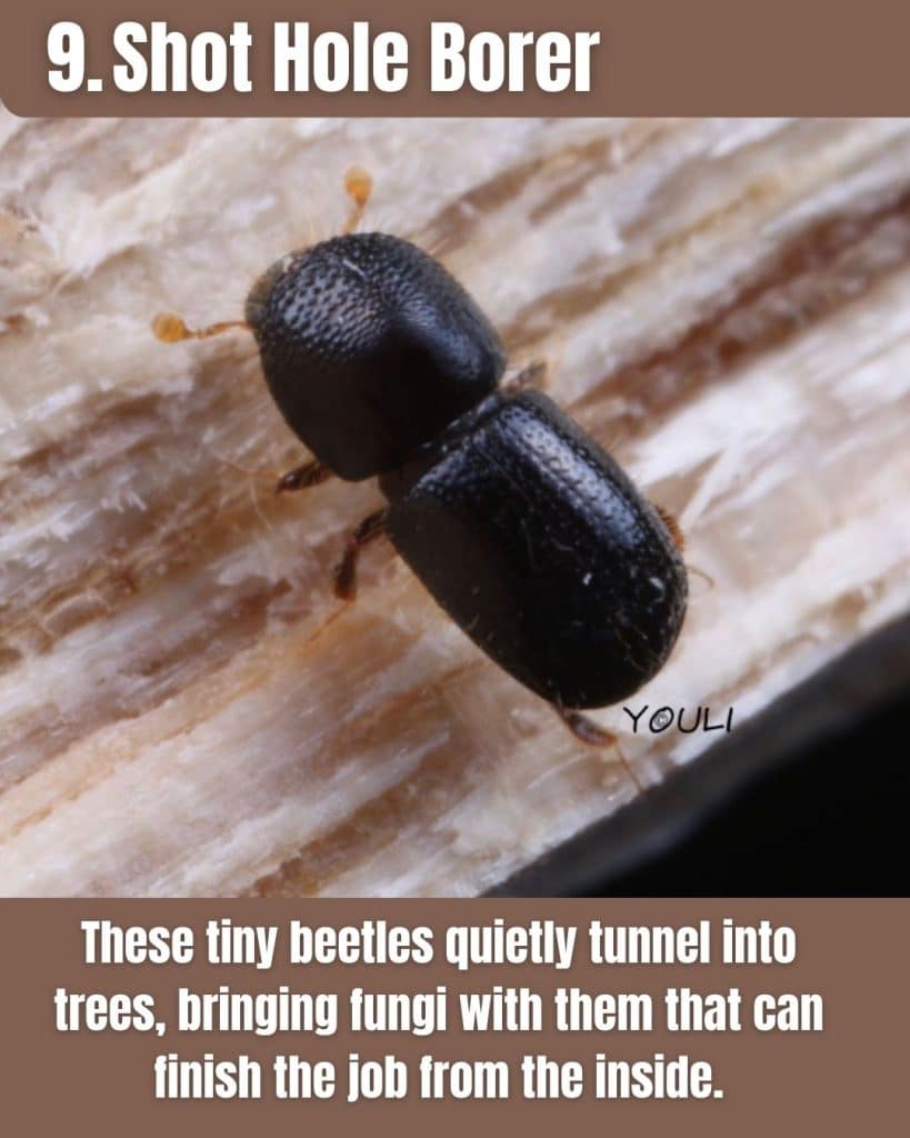 Shot hole borers are a big deal in California because they can attack many tree species, including common landscape and native trees. The damage isn’t always loud or obvious at first, then one day, the tree just looks like it’s losing the fight.