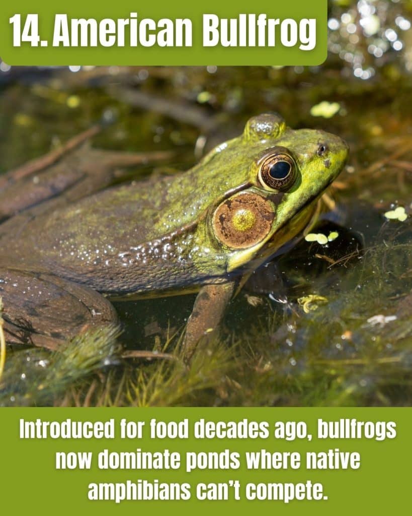 American bullfrogs were introduced in many areas for food and other reasons, and they spread into waters where native amphibians can’t compete. They’re larger, tougher, and they’ll eat just about anything that moves.