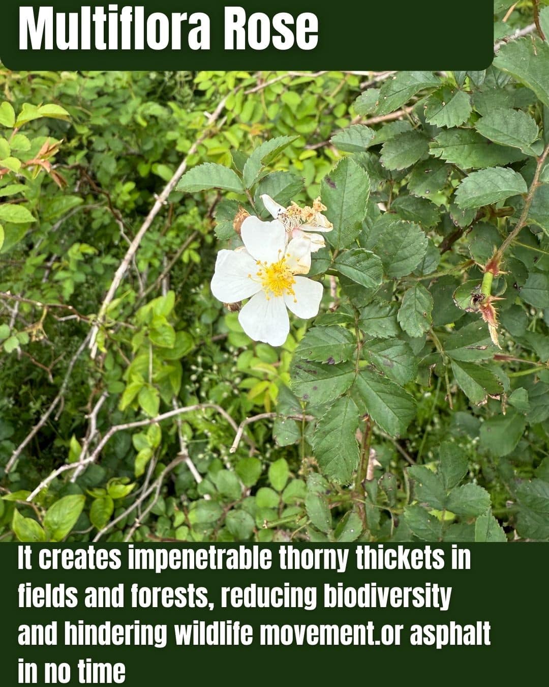 Multiflora Rose, an Asian shrub introduced in the 1800s for erosion control and wildlife habitat, has become a pervasive invader in New Jersey, dominating fields, forests, and roadsides with arching canes up to 15 feet.