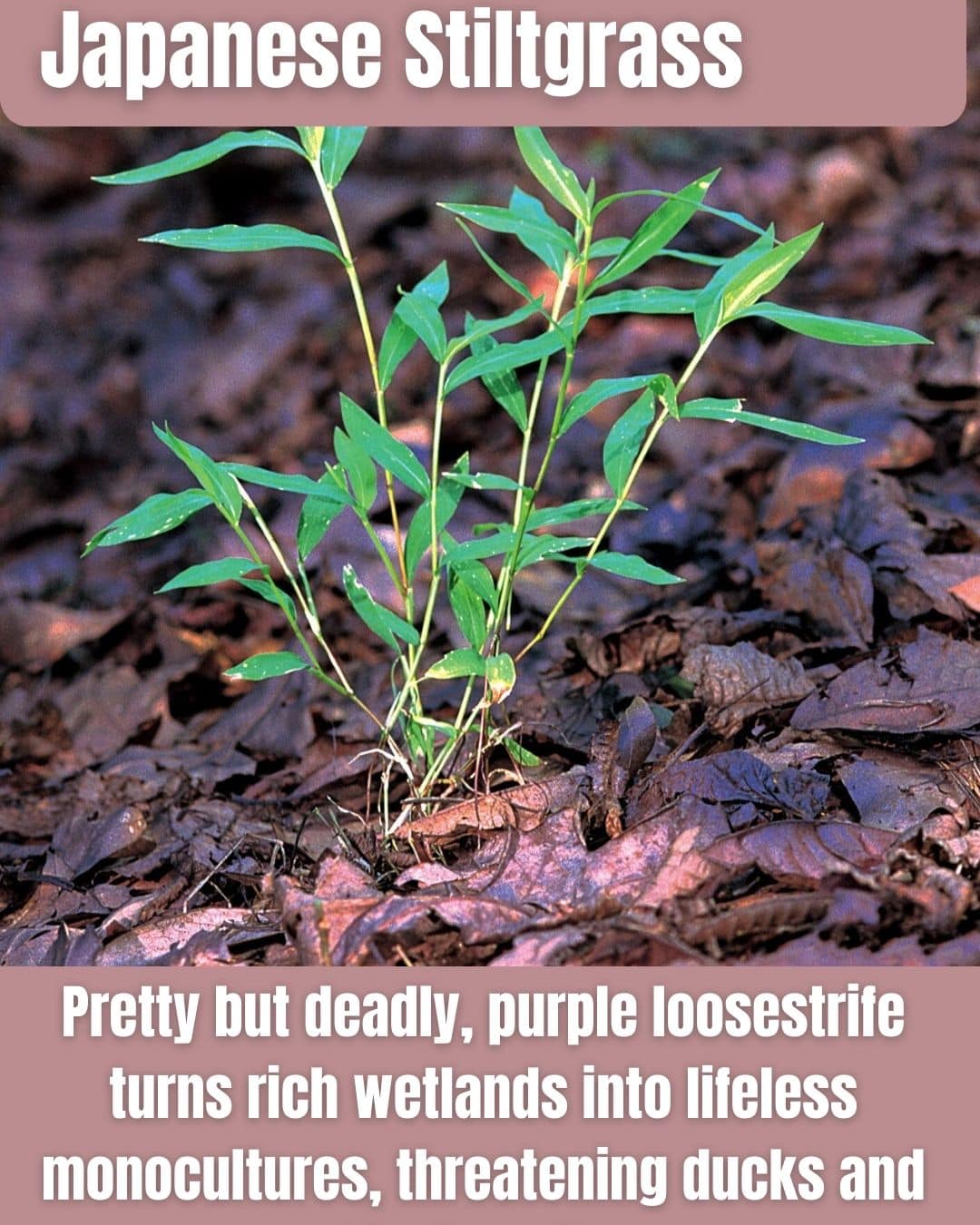 Japanese Stiltgrass, an Asian annual introduced in the 1910s as packing material, invades New Jersey woodlands and roadsides, forming dense mats that prevent tree regeneration.