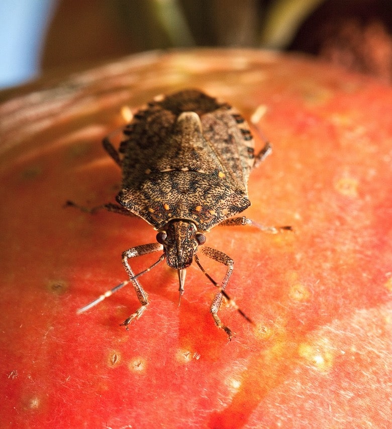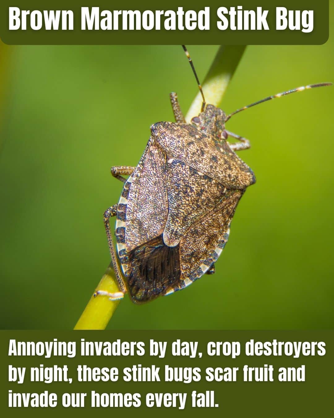 The Brown Marmorated Stink Bug, an Asian pest first found in NJ around 2004, damages fruits and vegetables by feeding, leading to deformities and mold.