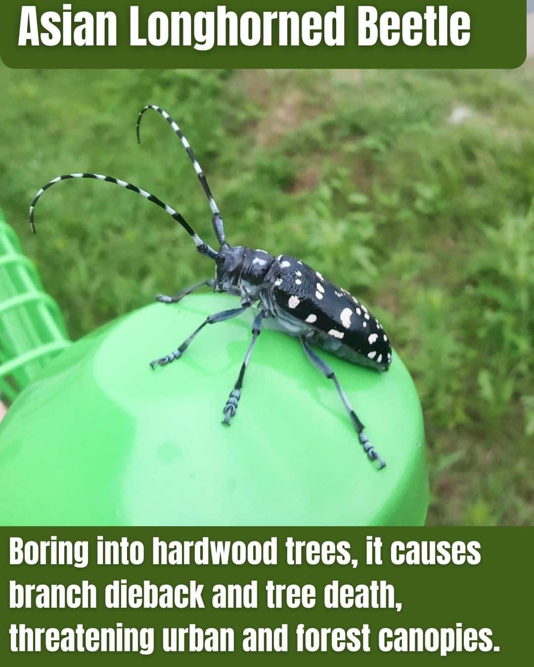 The Asian Longhorned Beetle, an Asian invader via wood packing, threatened NJ hardwoods by boring, causing dieback.