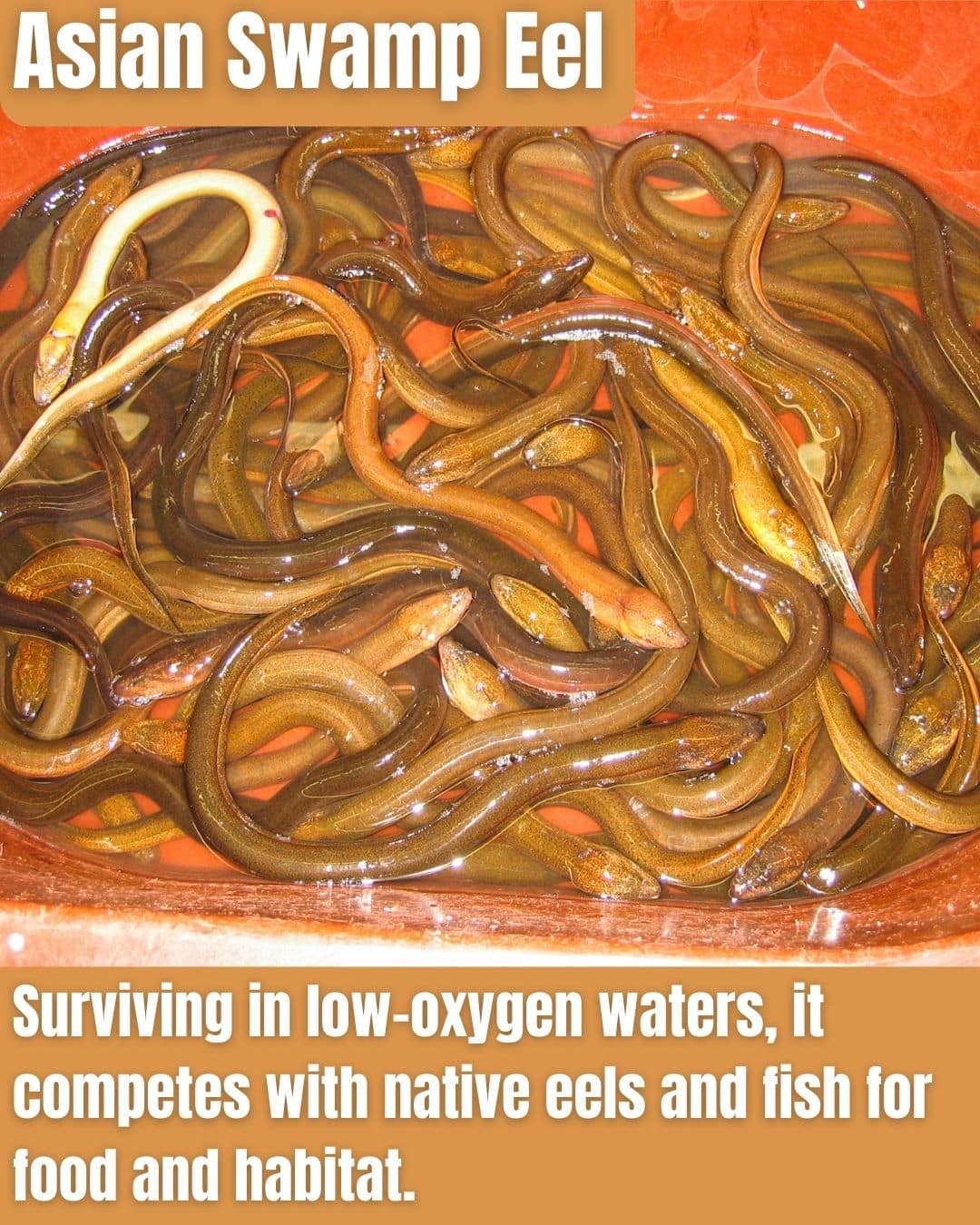 Asian Swamp Eel, an Asian import via food trade, invades NJ waters, outcompeting eels and amphibians.