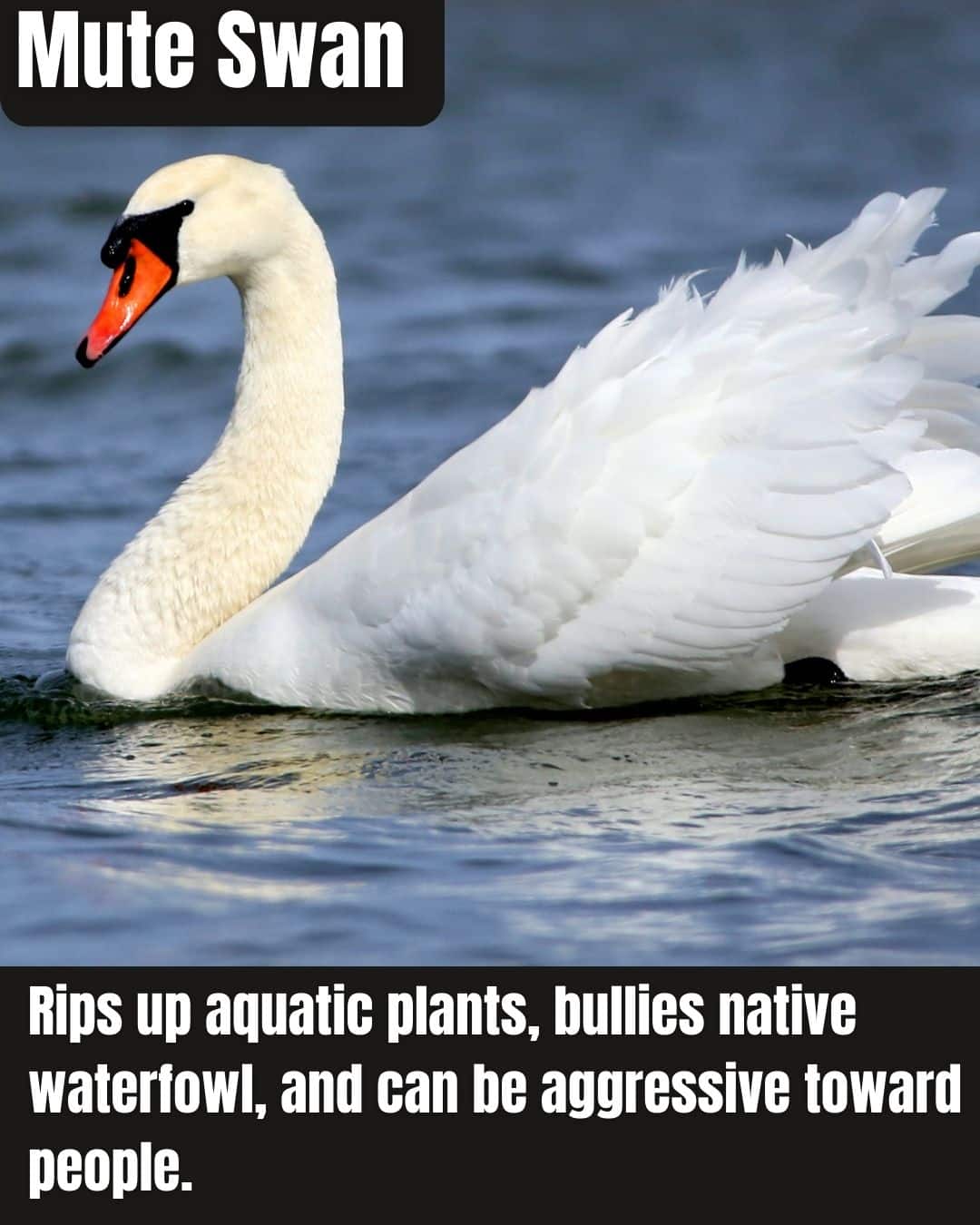 The mute swan is a European species that escaped captivity and now invades New Jersey waterways, where it aggressively displaces native ducks and other waterfowl.