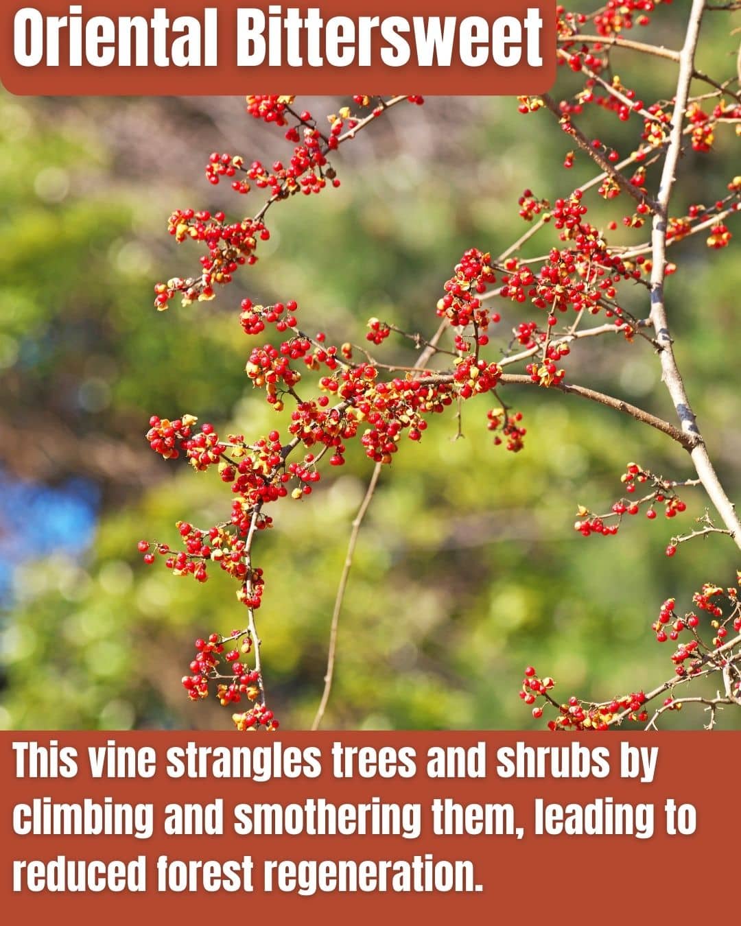Oriental Bittersweet, brought from Asia in the 1860s as an ornamental, aggressively invades New Jersey fields, forests, and roadsides, girdling trees with heavy vines that cause breakage during storms.