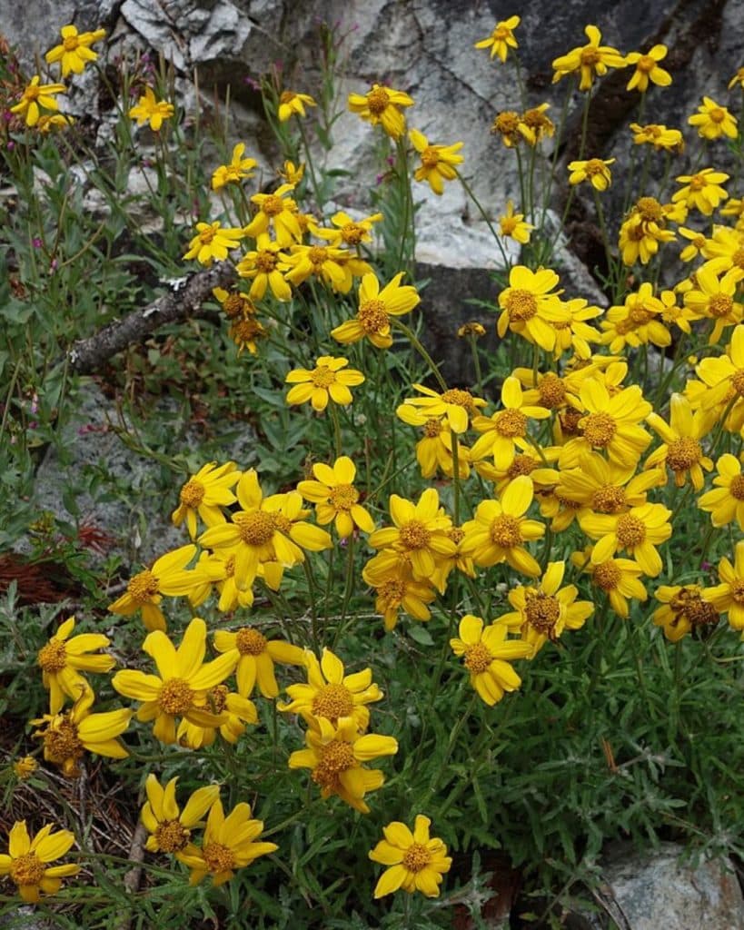 - Bright yellow daisy-like blooms with silver foliage.